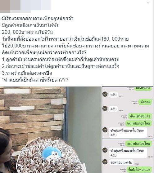 มีเรื่องจะขอสอบถามเพื่อนๆหน่อยจ้ามีลูกค้าคนนึงเอาเงินมาให้พับ200, 000บาทผ่านไป9วันทำแบบนี้เป็นมิจฉาชีพรึเปล่า วันนี้คนที่สั่งช่อดอกไม้โทรมาบอกว่าเงินในช่อมีแค่180, 000หายไป20,000บาทจะมาถามความรับผิดชอบจากทางร้านเลยอยากจะถามความคิดเห็นจากเพื่อนๆหน่อยว่าควรทำอยางไร