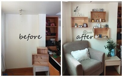 โดยเจ้าของกระทู้ได้ให้รายละเอียดว่า จัดมุมใหม่ค่ะ อยากได้พื้นที่ส่วนตัวของลูก ๆ เพิ่ม ตรงนี้เป็นบริเวณชั้นลอยของบ้าน กำหนด function เป็นส่วนกลางที่ทุกคำทำกิจกรรมต่างกัน แต่อยู่ร่วมกันค่ะ คือจัดแบบเดิมมา 10 ปี วันนี้เด็ก ๆ โตขึ้น เค้าอยากมีพื้นที่ส่วนตัว (แต่เรายังอยากอยู่ในบริเวณเดียวกัน ไม่ใช่ห้องใครห้องมัน) ส่วนที่เป็น Before เดิมวางโต๊ะยาวสำหรับคอมพิวเตอร์ของ 2 คน เลื่อนเอาโต๊ะมาวางด้านขวา แล้วจัดตรงนี้เป็นอาร์มแชร์ตัวใหญ่นุ่ม ๆ นั่งสบาย ตรงผนังเลยขอมี display น่ารัก ๆ โดยเอาของสะสมมาตกแต่งค่ะ